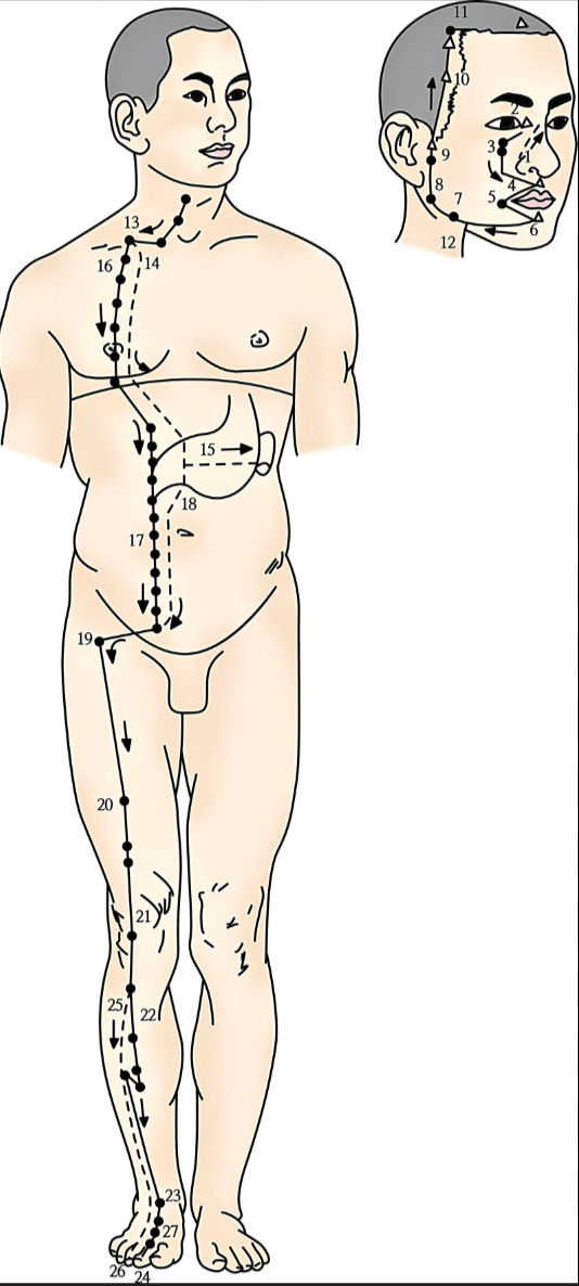 위장의 경락유주위장이 흐르는 길 : 우리몸의 지하철 노선도 위장이 우리 몸에 연결된 선옆에 그림을 한번 보실까요? 위장은 우리몸의 앞부분과 구석 구석 연결되어 있습니다. 이마부터 시작해서, 눈, 코, 잎, 턱, 목, 가슴, 허벅지, 무릎, 정강이, 발등, 발가락까지요. 이렇게 연결되어 있기 때문에 위장에 문제가 생기면, 이 연결된 부위들에 문제가 생길수 있습니다. 따라서, 소화가 잘 안되면, 머리가 어지럽고, 턱이 아플수 있는것입니다. 한번 쭉 보시고, 아래쪽을 보시면 훨씬 잘 이해 할수 있을것입니다. | ![]() |